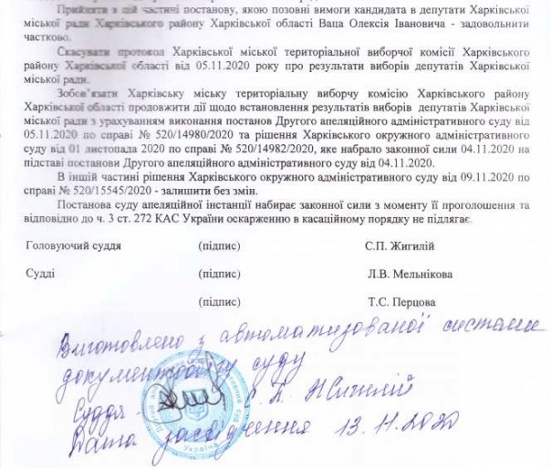 Апелляционный суд, разбирая дело вторично, вспомнил об уже принятии решения о пересчете голосов на отдельных участках по иску партии «Оппозиционная платформа — За жизнь» и постановил удовлетворить апелляционную жалобу частично. То есть, отменил предыдущее решение окружного суда и обязал ГИК «продолжить действия по установлению результатов выборов депутатов Харьковского городского совета».
