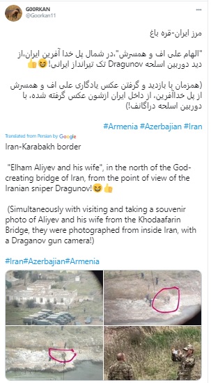 «Сейчас по иранским соцсетям и СМИ расходятся кадры президента Алиева, сделанные вчера через прицел иранского снайпера с иранской стороны границы», — написал военный эксперт.