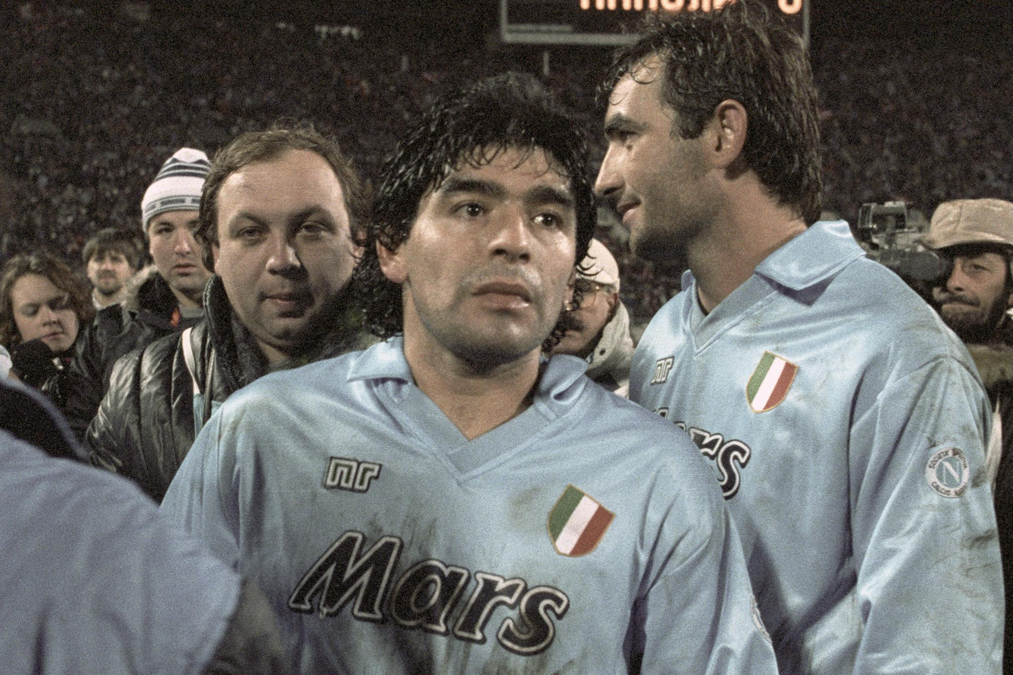 Rückspiel UEFA Cup Finale 1988/1989 in Stuttgart, Diego Armando Maradona und Ciro Ferarra (beide SSC Neapel) jubeln....Return match UEFA Cup Final 1988 1989 in Stuttgart Diego Armando Maradona and Ciro both SSC Naples cheer