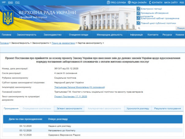 Как сообщается на сайте Рады, 3 декабря постановление о принятии этого проекта за основу зарегистрировала глава профильного комитета по вопросам социальной политики Галина Третьякова.