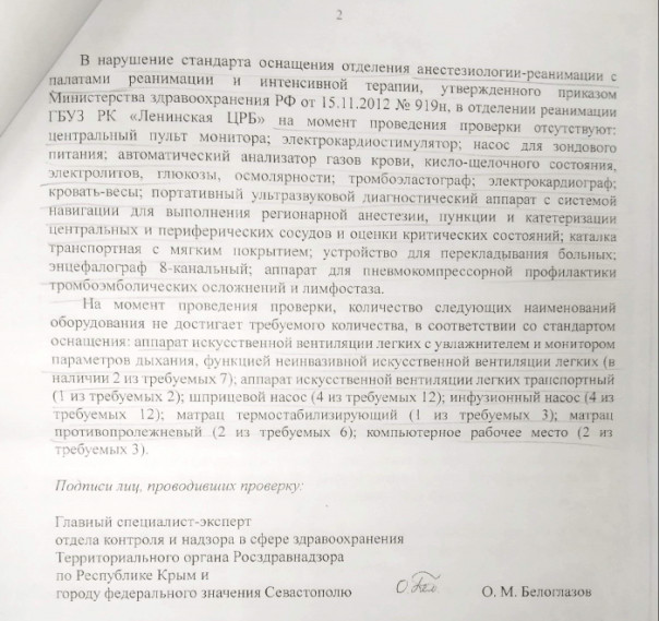 Однако как выяснилось немного позже, в своих отчётах руководству главврач сообщал недостоверные сведения. Так, согласно предоставленных в Минздрав отчётов, в отделении реанимации работает шесть коек, в то время как фактическое оснащение отделения позволяет использовать только три койки. Это является нарушением порядка оказания медицинской помощи по профилю «анестезиология и реаниматология». К тому же, проверка прокуратуры подтвердила нехватку оборудования в реанимации, из-за чего на главврача возбудили административные делопроизводства и вынесли обязательные к исполнению предписания.