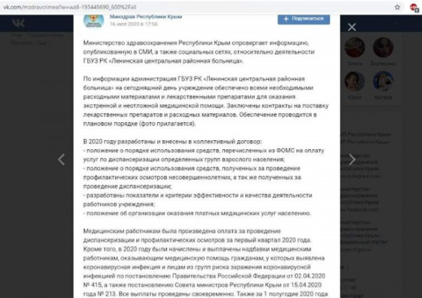 После публикации «Антифашиста» о проблемах здравоохранения в восточном Крыму, прокуратура выполнила проверку соблюдения трудового законодательства должностными лицами ГБУЗ РК «Ленинская ЦРБ» в условиях распространения новой коронавирусной инфекции. По результатам проверки стало известно о случаях выплаты заработной платы сотрудникам медучреждения ниже минимально допустимого уровня оплаты труда.