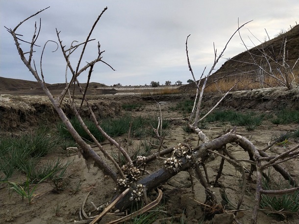 По словам автора фото, отсюда берут воду на полив, некоторые шланги уже не достают до поверхности воды. Под ногами хрустят раковины пресноводных моллюсков, поскольку дно водоема обнажилось.