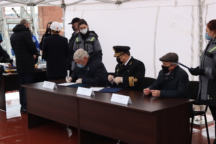 Акт о закладке подписали руководители ФГУП «Атомфлот», филиала ФАУ «Российский морской регистр судоходства» и АО «Балтийский завод»