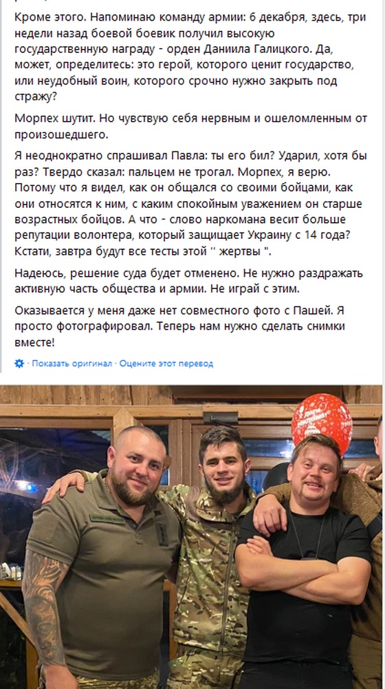 При этом «патриоты» подчёркивают, что «Морпех» — боевой командир и недавно был награждён орденом Даниила Галицкого. Защитники комбата уверены, что его травля является частью общей политики изгнания «патриотов» из ВСУ.