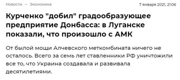«Курченко добил градообразующее предприятие Донбасса: в Луганске показали, что произошло с АМК» — пишут украинские СМИ, публикуя фотографии заброшенных цехов крупнейшего градообразующего предприятия ЛНР Алчевского металлургического комбината. Украинские журналисты отмечают, что «за семь лет ставленники РФ уничтожили всё, что Украина создавала десятилетиями».