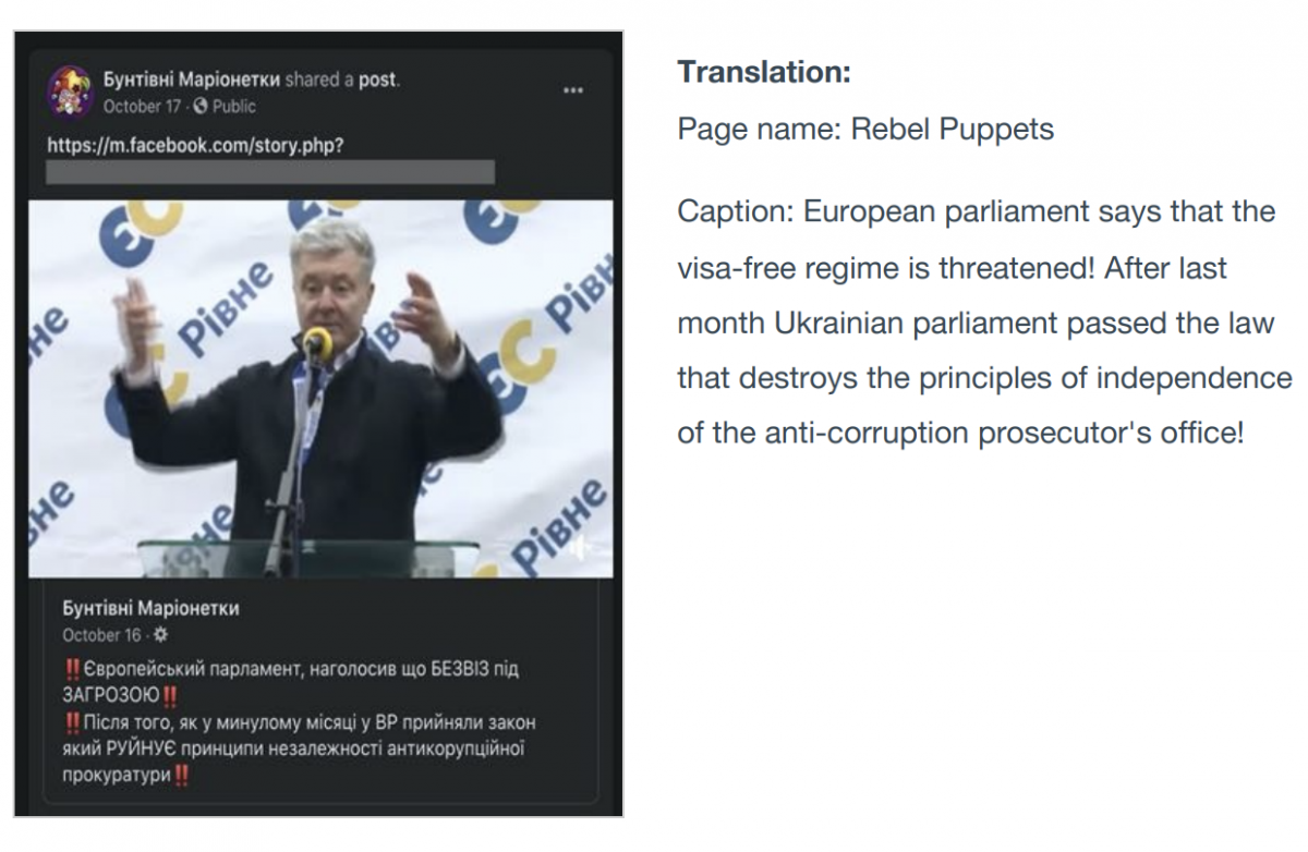 В то же время Facebook снес аккаунты, в которых фигурирует «Европейская солидарность» Петра Порошенко. Бан получен за «недостоверное поведение».