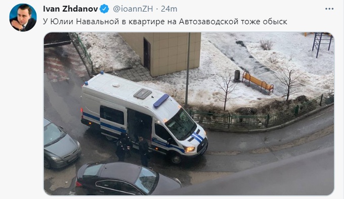 По информации Жданова, сегодня из спецприемника для проведения обыска по месту жительства привезли пресс-секретаря Алексея Навального Киру Ярмыш. Она сейчас находится под административным арестом. 22 января Ярмыш арестовали на девять суток за призывы к участию в протестах.