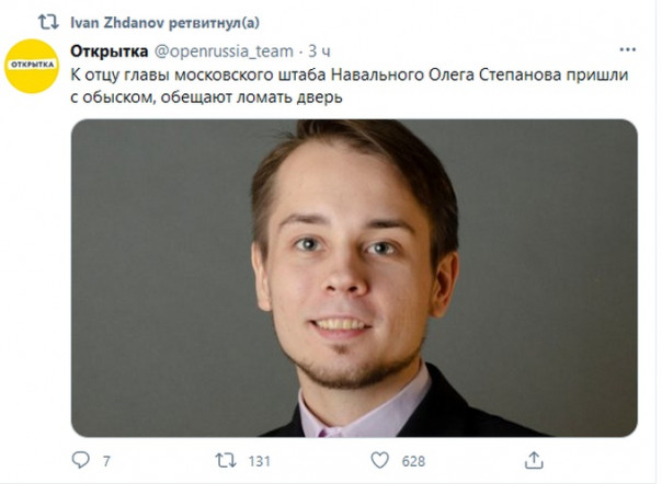 «В Марьино в квартиру Алексея Навального пришли с обыском. Много "тяжелых" в масках. Начали ломать дверь. В квартире находится Олег Навальный (брат политика — ред.)»,— написал Жданов.