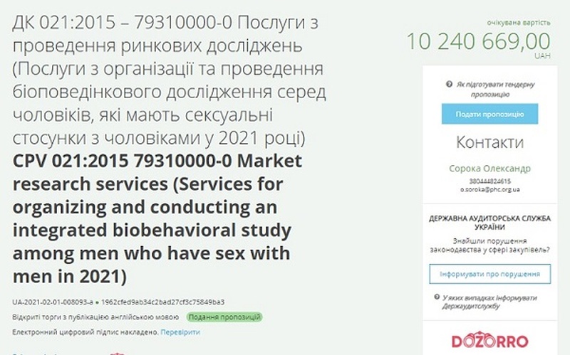 Государственное учреждение «Центр общественного здоровья» Министерства здравоохранения Украины 1 февраля 2021 года объявило тендер на закупку услуг в сфере опросов по проведению биоповеденческого исследования среди гомосексуалистов. На эти цели планируется выделить более 10 млн гривен.