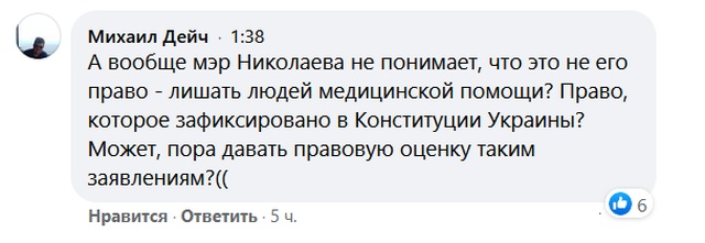 «Сейчас в Николаеве проводится вакцинация от коронавируса. Те, кто будут писать отказы от вакцинации, будут лечиться, если заболеют коронавирусом, не за счет НСЗУ, как сейчас, а за собственный. Это около 5-10 тысяч гривен в сутки», — предупредил градоначальник Николаева.