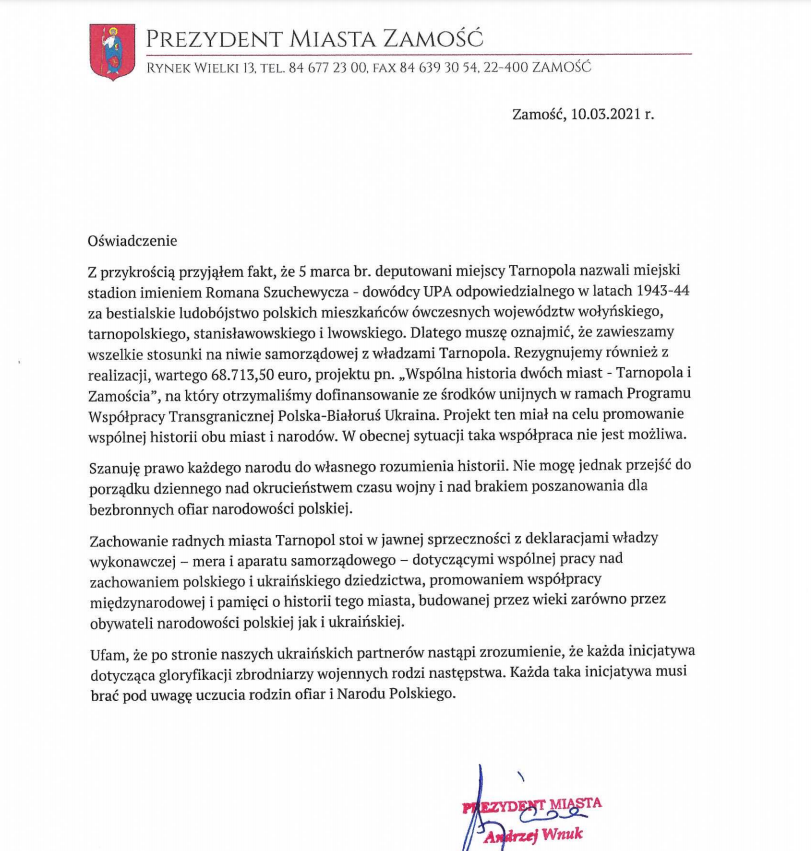 «С прискорбием констатируем факт, что 5 марта депутаты совета Тернополя назвали городской стадион именем Романа Шухевича — руководителя УПА, ответственного за зверские убийства польского населения в 1943-44 годах», — сообщили на сайте городских властей Замостья.