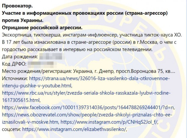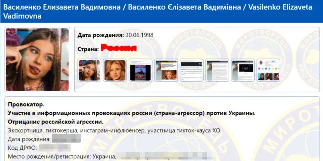 На "Миротворце" написали, что Василенко "экскортница, тиктокерша, инстаграм-инфлюенсер, участница тикток-хауса XO. В 17 лет была изнасилована в стране-агрессоре (России) в г.Москва, о чем с гордостью рассказывает в интервью на российском телевидении".