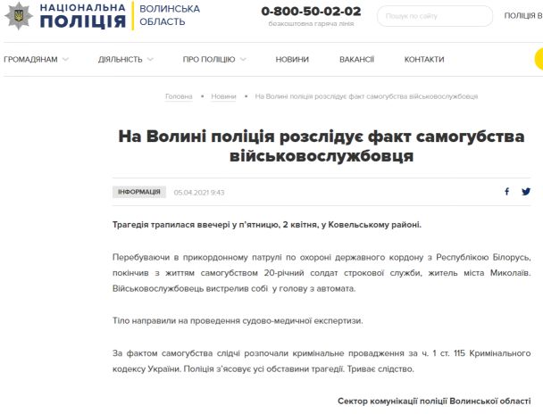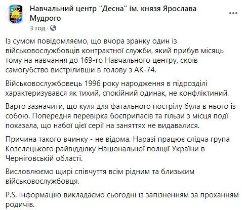 Напомним, практически наряду с этим в учебном центре Десна в Черниговской области 2 апреля совершил самоубийство военнослужащий контрактной службы, который прибыл на обучение месяц назад. Он выстрелил себе в голову из АК-74. Скриншот сообщения об этом распространили украинские СМИ: