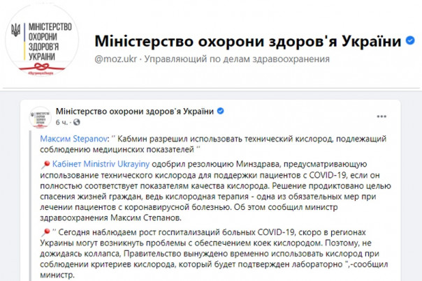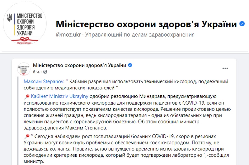 В результате сегодня Кабинет министров Украины одобрил резолюцию Минздрава, предусматривающую использование технического кислорода для поддержки пациентов с COVID-19, если он полностью соответствует показателям качества кислорода. Решение продиктовано целью спасения жизней граждан, ведь кислородная терапия — одна из обязательных мер при лечении пациентов с коронавирусной болезнью. Об этом сообщил министр здравоохранения Максим Степанов. Соответствующее постановление Кабинет министров Украины принял в пятницу, 9 апреля.