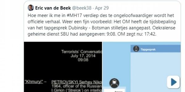 Эрик ван де Бек в своем Twitter-аккаунте рассказал о том, что прокуратура одним взмахом пера скорректировал время переговоров одного из главных подозреваемых Сергея Дубинского с неким «Боцманом». То есть, СБУ передала голландскому правосудию, якобы перехваченные переговоры тех людей, которые якобы могли быть причастны к трагедии. На одной из записей стояла дата 17 июля 2014 года и время (внимание – это важная деталь) 09:08. Прилагаю фото.