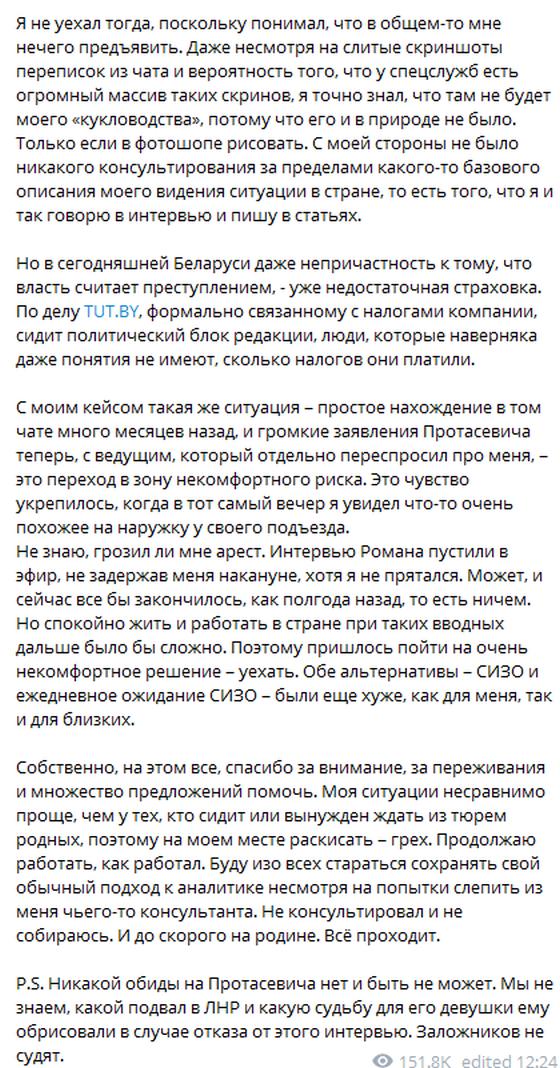 И все это произошло потому, что, как написал политолог, «в интервью на ОНТ Роман Протасевич сказал, что я помогал советами в чате, который можно было назвать координационным штабом революции».