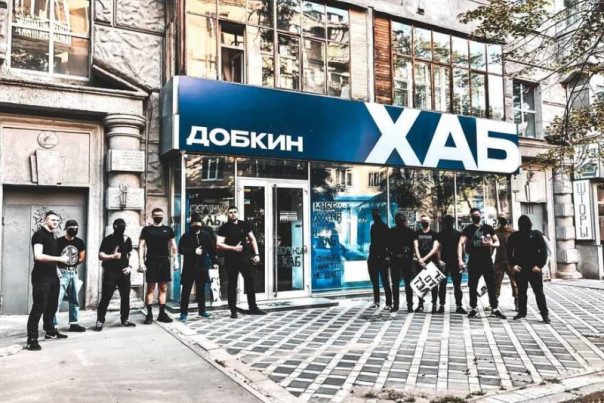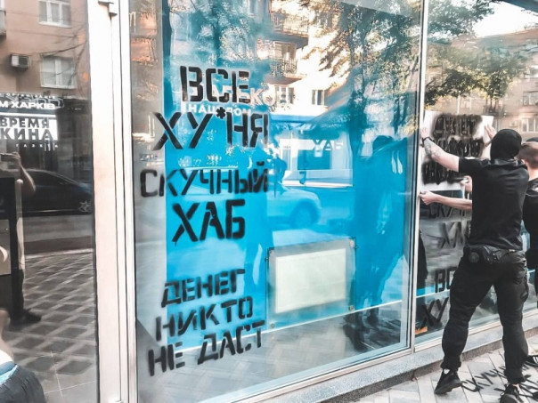 Сегодня утром молодчики из организации харьковских нацистов «Фрайкор» провели так называемый ребрендинг одного из центров «ДОБКИН ХАБ». Нацисты разрисовали краской двери и окна центра, о чём гордо сообщили в своём официальном телеграм-канале.