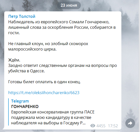 «Наблюдатель из европейского Сомали Гончаренко, лишенный слова за оскорбления России, собирается в гости. Не главный клоун, но злобный скоморох малороссийского цирка. Ждём. Заодно ответит следственным органам на вопросы про убийства в Одессе. Готовы билет оплатить в один конец», - заявил Толстой в том же Telegram.