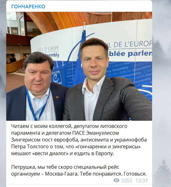 Гончаренко запись Толстого не понравилась и он сегодня огрызнулся, подкрепившись фото в компании депутата литовского парламента и делегата ПАСЕ Эмануэлиса Зингериса, и уверенностью, что никаким наблюдателем на выборы в Госдуму не поедет, пообещал Толстому «скоро» организовать для него «рейс Москва-Гаага». Источник