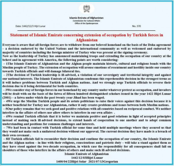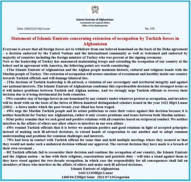 Еще в начале июня представитель талибов заявил, что Турция должна вывести свои войска из Афганистана в рамках соглашения США и «Талибана». Тем самым талибы дали недвусмысленный ответ на предложения Анкары оставить свои войска для охраны Кабульского аэропорта. Несмотря на это Турция до последнего времени заявляла, что оставит своих военных для контроля и безопасности в международном аэропорту Кабула.