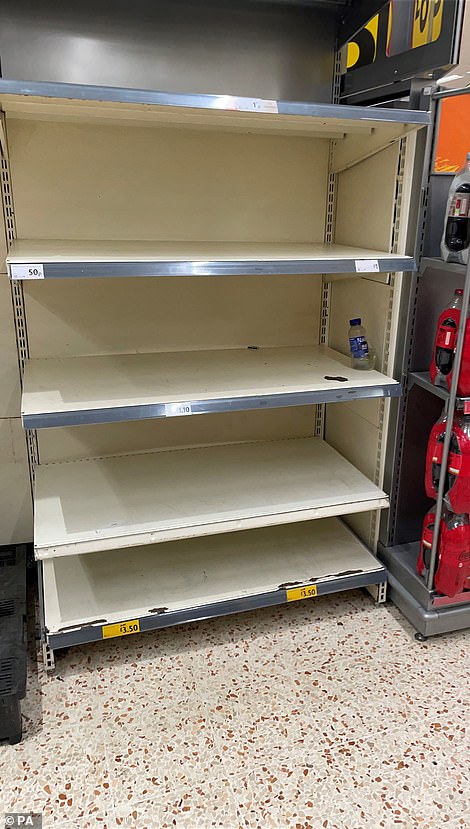 Один покупатель из Lidl в Мирфилде, Западный Йоркшир, сказал MailOnline, что ситуация была "насмешкой" и ощущалась как начало блокировки 2020 года, описав "пустые морозильные камеры, почти нет вина и практически нет моющего средства", добавив: "Далее будет нормирование".