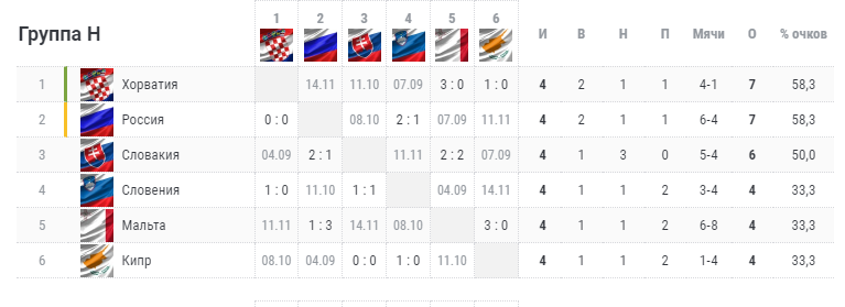 Сборная России за четыре проведённых тура набрала семь очков и занимает второе место в турнирной таблице группы H. Национальная команда Хорватии (7) – находится выше по дополнительным показателям.