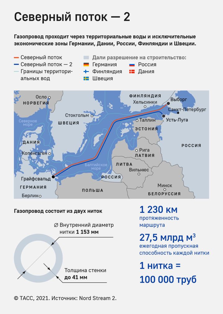 Проект предполагает строительство двух ниток газопровода общей мощностью 55 млрд кубометров в год от побережья России через Балтийское море до Германии. Работы были приостановлены в декабре 2019 года после того, как швейцарская Allseas отказалась от укладки труб из-за угрозы санкций США. С декабря 2020 года строительство газопровода было возобновлено.