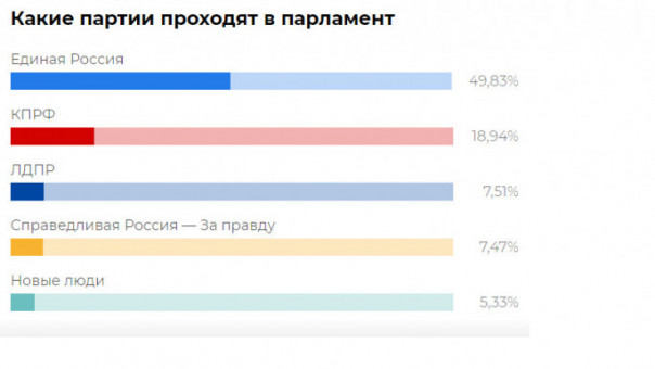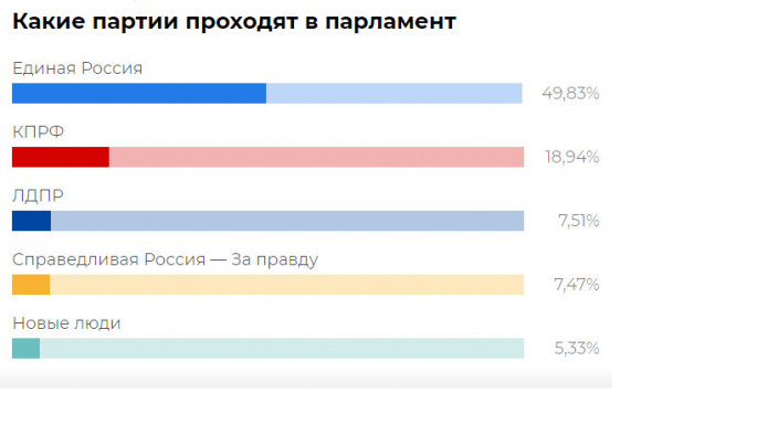 Разумеется, лидирует партия "Единая Россия". С 49,83% голосов. На втором месте КПРФ - 18,94%. Заканчивается эпоха ЛДПР, старик со спадающими штанами Жириновский сдаёт позиции (7,51%). Мироновско-прилепинская "Справедливая Россия — За правду" получила 7,47%.