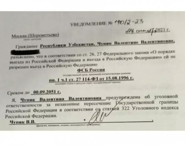 ТГ-канал "Медиатехнолог": "В Шереметьево задержали гражданку Узбекистана Валентину Чупик (нет, это не криминальная кличка, это реальная фамилия). Чупик известна, как руководитель организации "Тонг Жахони", которая занимается защитой прав трудовых мигрантов. Прославилась она лекциями для приезжих из Средней Азии, про то, как можно обманывать миграционные органы, обходить российские законы, делать левые регистрации, ну и ещё постоянными истериками о врождённой русской ксенофобии на страницах различных либеральных изданий. У Чупик на территории РФ был статус беженца, так как она не в ладах с властями Узбекистана. После задержания ей вручили уведомление о том, что статуса беженца она лишена, а также ей на 30 лет запрещён въезд в Россию. Прямо сейчас решается вопрос о том, в какую страну депортировать Чупик, вероятно её отправят в третью страну, так как в Узбекистане у неё могут быть проблемы. Впрочем, дела нам до этой дамы нам нет никакого, правами человека там никогда и не пахло, "Тонг Жахони" обслуживала интересы компаний, которые занимаются поставкой дешёвой рабочей силы на российские стройки. Прикрываясь борьбой за национальные и культурные права мигрантов, Чупик одновременно потворствовала нарушению трудовых прав граждан из стран Средней Азии".