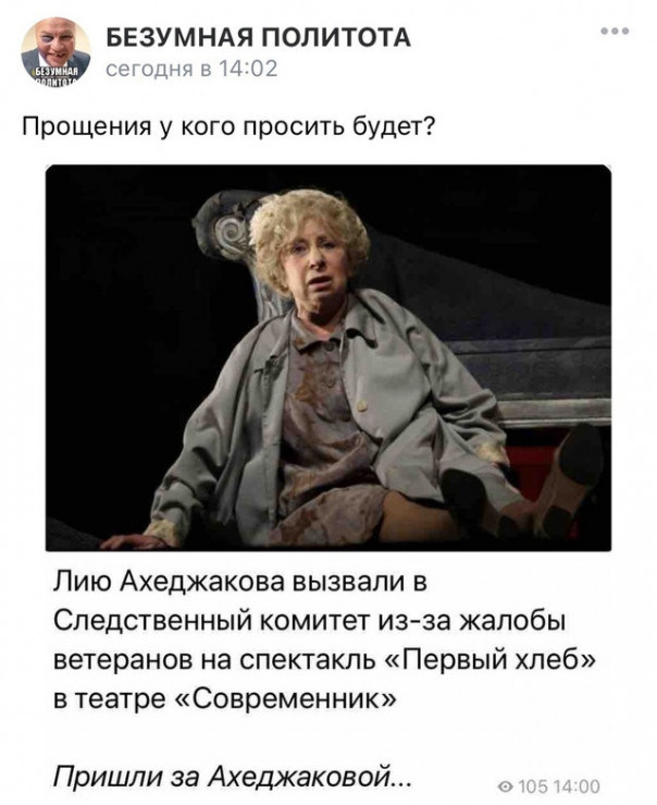 Актриса рассказала об этом на сборе труппы театра "Современник". Ахеджакова отметила, что ее приглашали в СК, чтобы поговорить о спектакле "Первый хлеб", на который подала жалобу об оскорблении ветеранов общественная организация "Офицеры России".