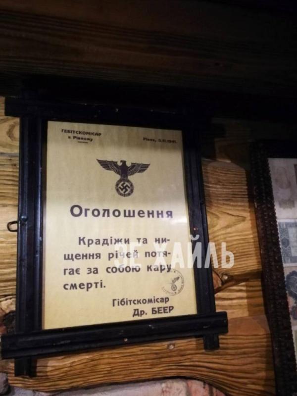 «Ничего необычного для Украины. Просто кафе в Ровно полно нацисткой символики. Что характерно, символика нацистских коллаборационистов УПА находится в одном ряду со свастикой. Однозначно - это нарушение украинского законодательства, но владельцы забегаловки зарегистрировали её, как музей-кафе, а закон о запрете символов тоталитарного режима на музеи не распространяется. Вот так просто, с молчаливого согласия общественности и полного одобрения властей, в Ровно чтут нацистов и их пособников.
