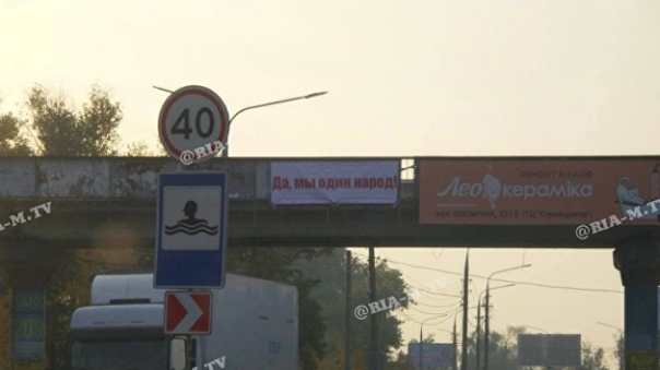 В Запорожье на мосту вдоль Прибрежной автомагистрали местные жители заметили интересный плакат. Надпись на нем касалась родства украинской и русской наций. Об этом 13 октября написал ria-m.tv