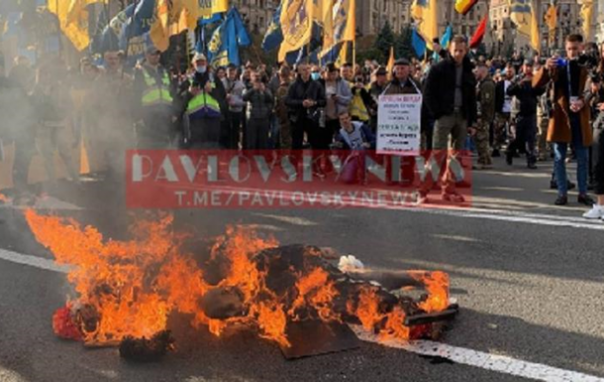 Журналисты «Страны», освещающие сегодняшний марш националистов, которые вышли на улицу в честь нового государственного праздника — дня защитника Украины, а заодно отметить очередную годовщину создания Украинской повстанческой армии подчеркнули, что новый марш показал достаточно скромное количество представителей радикальной тусовки. Кроме того, в этом году «патриоты» решили даже не ходить на Банковую, а вместо этого сожгли чучело президента Украины Владимира Зеленского прямо на Крещатике: