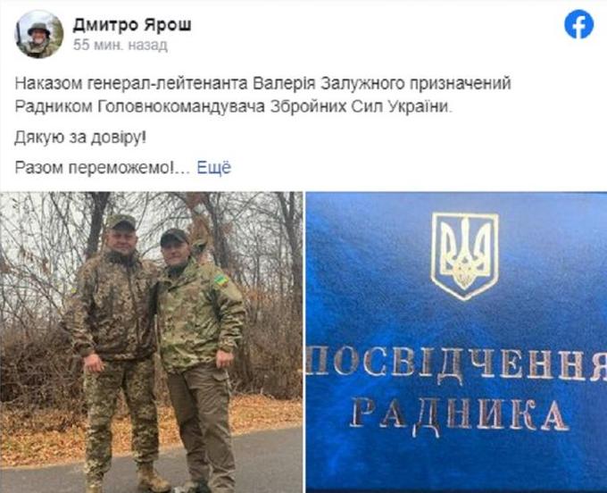 В качестве доказательства своих слов он опубликовал совместное фото с Залужным и снимок своего нового удостоверения.