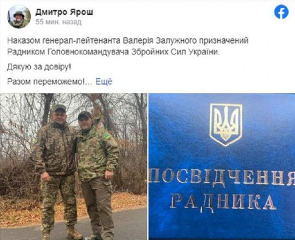 Бывший лидер «Правого сектора» и экс-депутат Верховной рады Украины Дмитрий Ярош официально назначен советником главнокомандующего ВСУ.