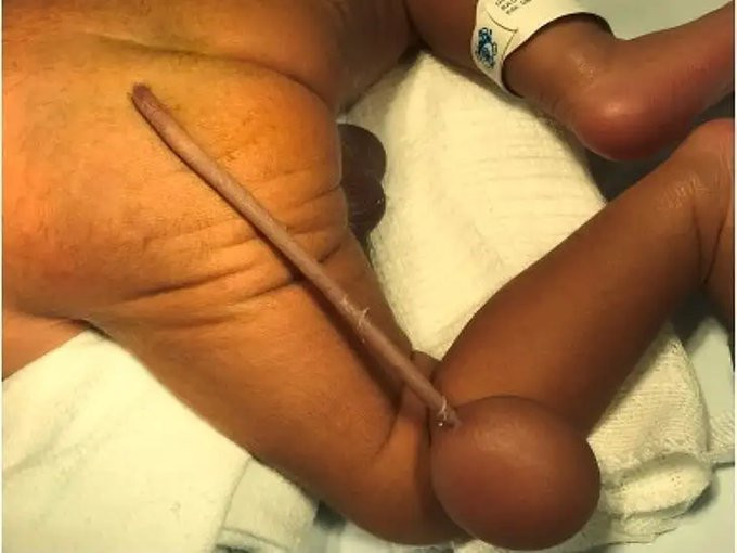 Врачи удалили настоящий человеческий хвост со страшным шариком на конце, выросший у младенца.