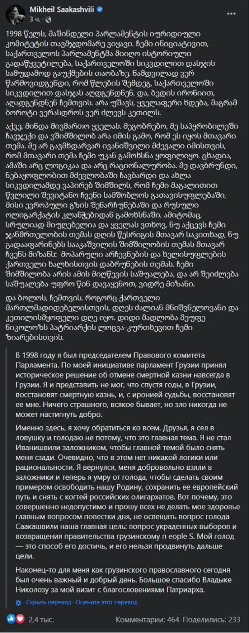 Голодающий заключенный Саакашвили активен в соцсетях. Сегодня он написал в Фейсбуке, что готовится умереть с голоду, чтобы "вырвать Грузию из когтей российских олигархатов".