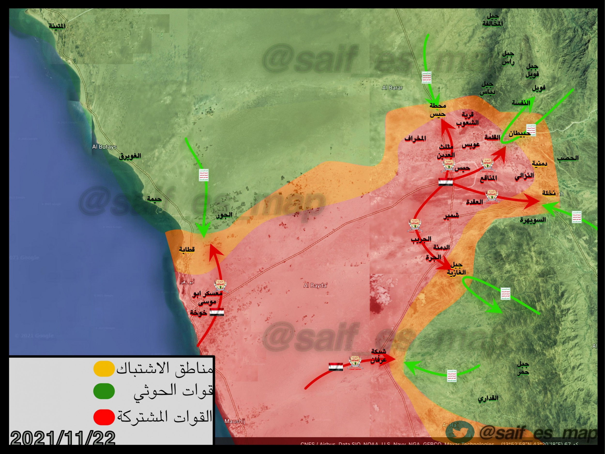 Сами хадисты жалуются на постоянную работу артиллерии хуситов и снайперов по их позициям. Помимо этого, периодически к атакующим прилетают и вражеские «дроны-камикадзе». Отдельным препятствием для продвижения наступающих стали обильные минные поля хуситов. Так из-за мин периодически подрываются войска как на переднем крае, так и на ранее захваченной территории.
