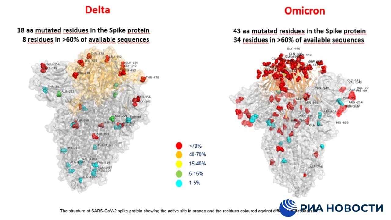 Итальянские ученые представили первую в мире "фотографию" шиповидного белка (он же "спайк-белок" - spike-protein) нового штамма "омикрон", на лабораторной реконструкции выделены множество мутаций в сравнении со штаммом "дельта" и первоначальным вариантом коронавируса.
