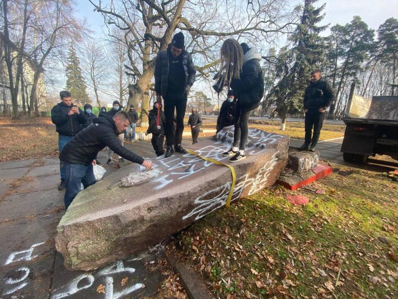 Это не первая попытка сноса монумента. На этот раз «патриотам» из «Гонора» удалось это сделать. Перед сносом они осквернили гранитный памятник, нанеся надписи «НКВД — палачи» и «Слава Украине». После чего столкнули его с постамента с помощью грузовика.