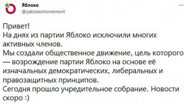 Исключённые моментально создали собственное общественное движение с тем же названием и тем же логотипом: "Цель — возрождение партии Яблоко на основе её изначальных демократических, либеральных и правозащитных принципов".