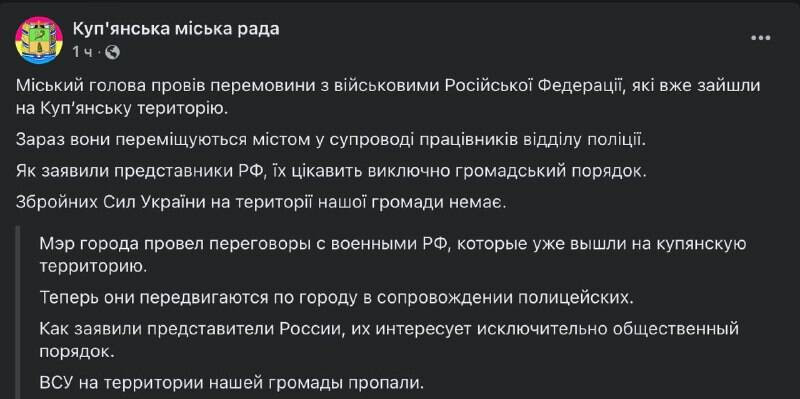 Мэрия Купянска под Харьковом заявила, что российские войска мирно и без боя заняли город. После переговоров колонна техники ВС РФ продолжила движение в сопровождении украинских полицейских. Военных ВСУ в Купянске нет