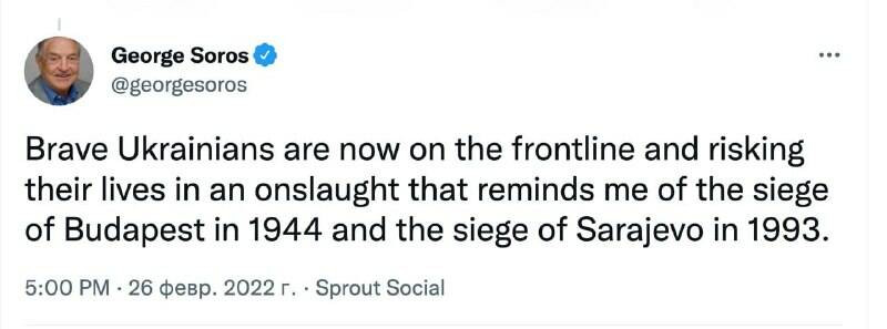 Джордж Сорос назвал украинцев такими же храбрыми, как войска Вермахта и СС, оборонявшими Будапешт от наступающей Советской Армии (входящей, напомним, в антигитлеровскую коалицию). Это его подлинный твит на подтвержденном аккаунте.