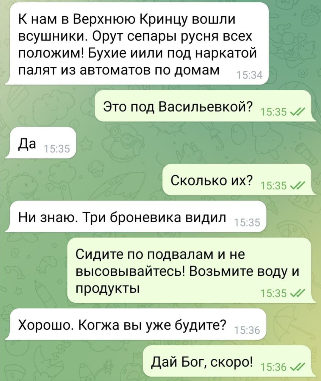 В село Верхняя Криница в паре километров от Васильевки Запорожской области вошла колонна ВСУ. Они ведут беспорядочный огонь по домам мирных жителей с криками: "Сепары, русня, всех положим!"