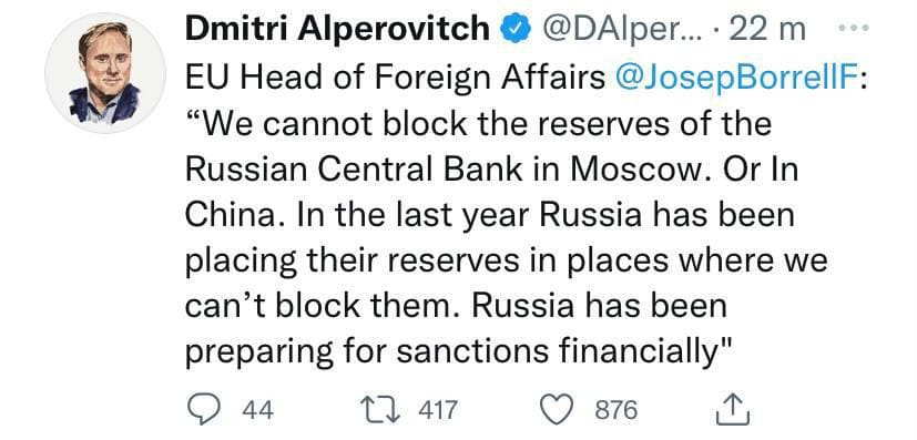Жозеп Боррель признал, что Евросоюз не может блокировать активы ЦБ России, из-за того, что Россия подготовилась к санкциям