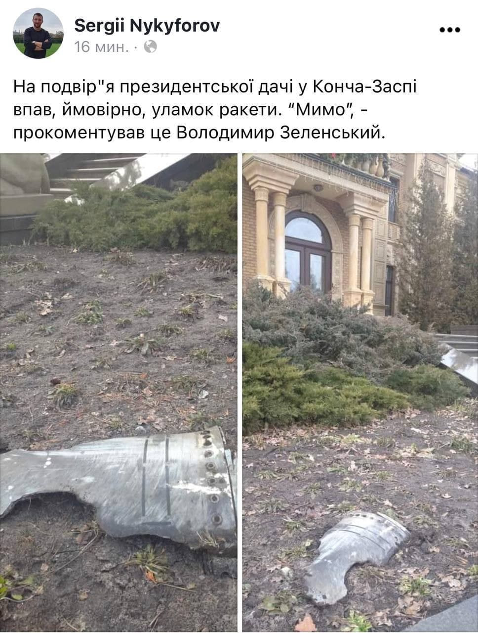 По его словам, во двор президентской дачи в Конча-Заспе упал «вероятно, кусок ракеты».