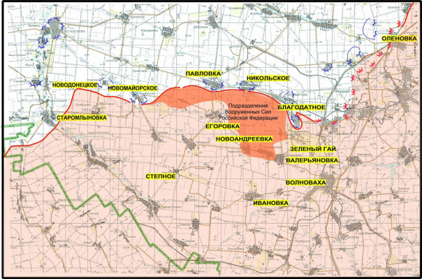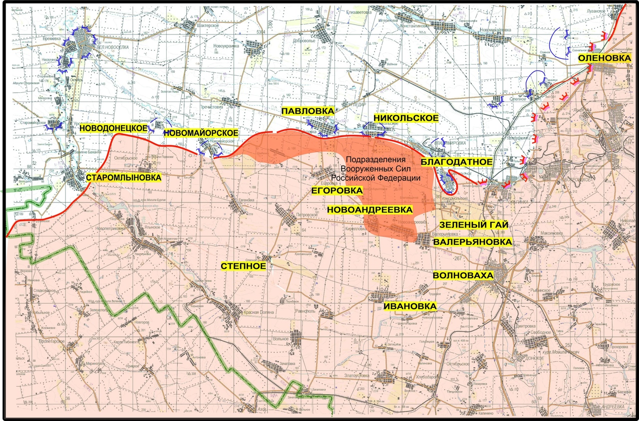 ▪ Вооруженные Силы Российской Федерации, продолжая наступление на широком фронте установили контроль над населенными пунктами НОВОАНДРЕЕВКА, КИРИЛОВКА и вышли на рубеж НОВОМАЙОРСКОЕ – ПАВЛОВКА - НИКОЛЬСКОЕ - ВЛАДИМИРОВКА - БЛАГОДАТНОЕ.
