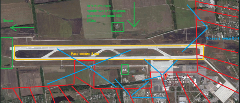 Все прошедшие сутки продолжались боестолкновения между подразделениями украинских силовиков и ополчением в районе Донецкого аэропорта. ВСУ терпят поражение, однако, по предварительным данным, в здании нового терминала, последнем опорном пункте аэропорта, контролируемом ВСУ, осталось несколько разрозненных очагов сопротивления. Поддержку окружённым в аэропорту силовиками оказывали подразделения, дислоцированные в непосредственной близости от аэропорта и близ населенных пунктов Пески и Авдеевка. За истекшие сутки украинская сторона потеряла в аэропорту несколько единиц боевой техники. По данным ополчения, у ВСУ более 10 человек убито, около 10 бежали, бросив 6 обгоревших бойцов в терминале, и заняли оборону в районе разрушенной вышки. В результате штурма терминала один ополченец погиб, 8 получили ранения.