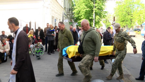 Гроб с телом встретил возле Свято-Михайловского кафедрального собора раскольнической ПЦУ в Житомире отец погибшего, «священник» Василий Солонинка, также ранее воевавший на Донбассе.